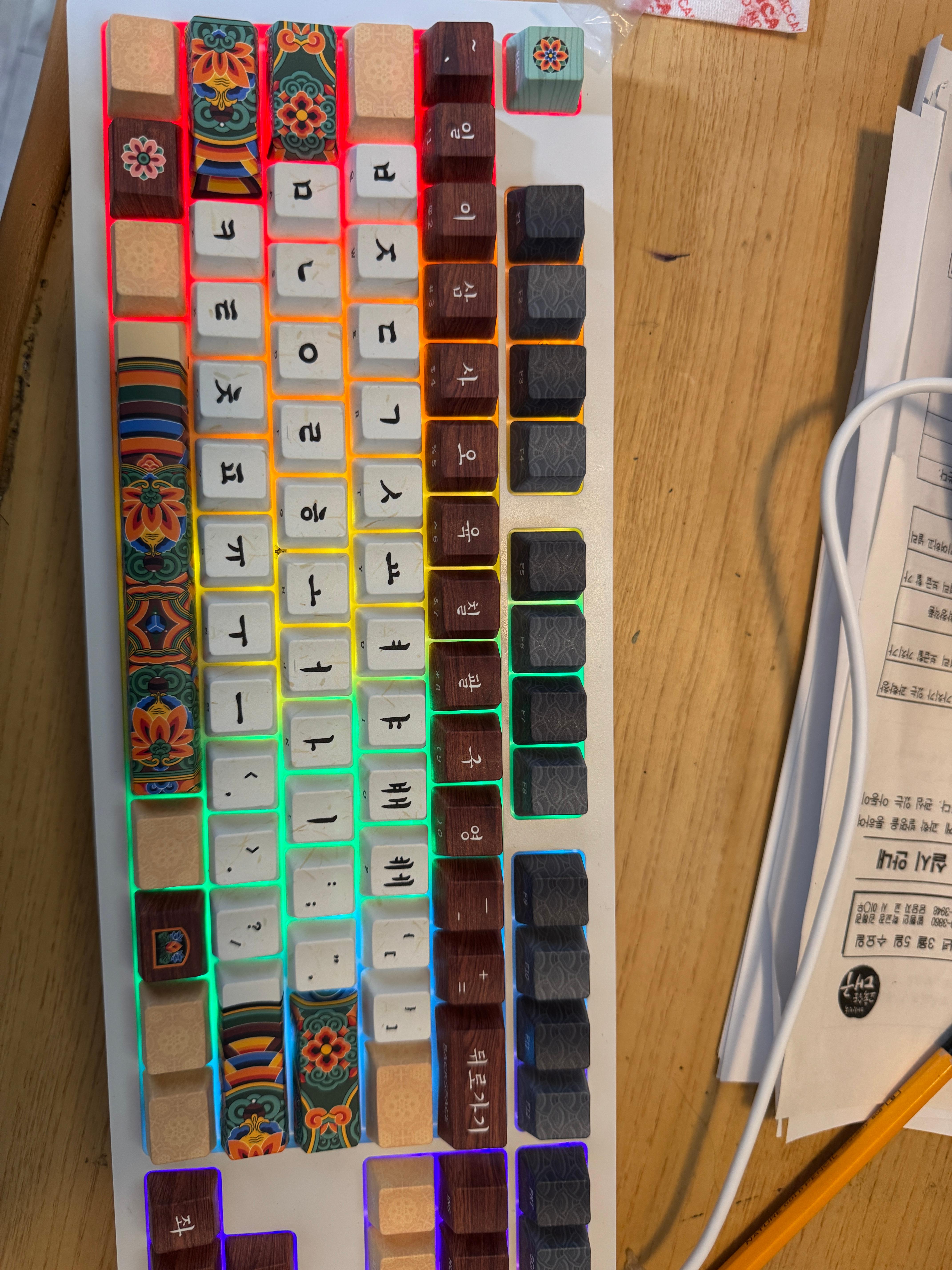 키캡 하나하나에 단청의 연꽃 문양이 섬세하게 새겨져 있습니다. 스페이스바, 시프트 키 등은 전부 다른 문양을 가지고 있어, 마치 전통 건축의 일부를 보는 듯한 느낌을 줍니다. 특히 한글 키캡은 영어가 아닌 한글 서체로 되어 있어, 매일 쓰는 키보드에서 한국의 전통미를 느낄 수 있습니다.